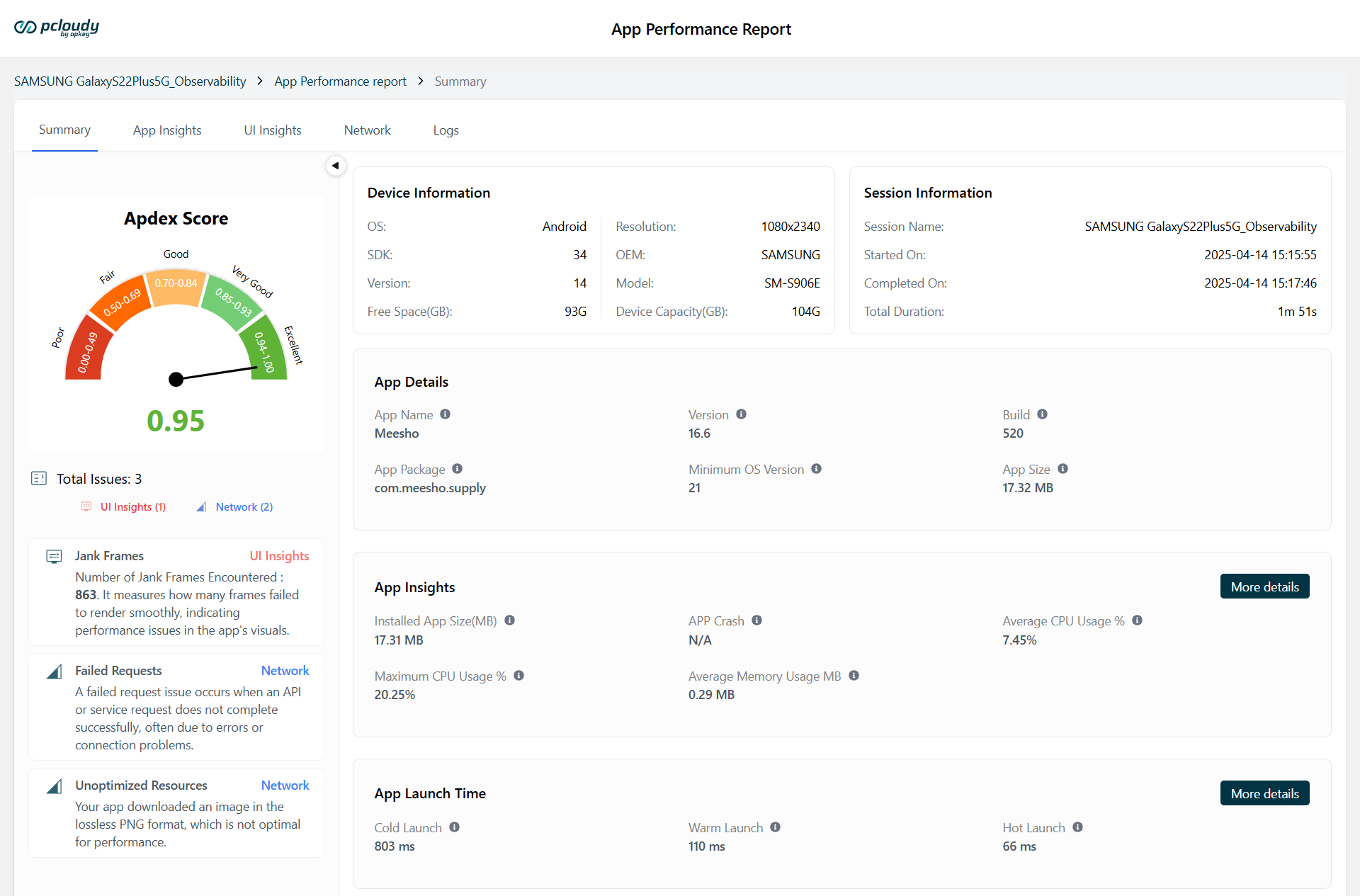 Pcloudy leverages Apdex ratings to give you a unified, quantifiable view of your application’s performance and its impact on end-user satisfaction. Whether you're analyzing a full test session or individual user actions, Apdex simplifies complex performance data into a single, actionable metric.