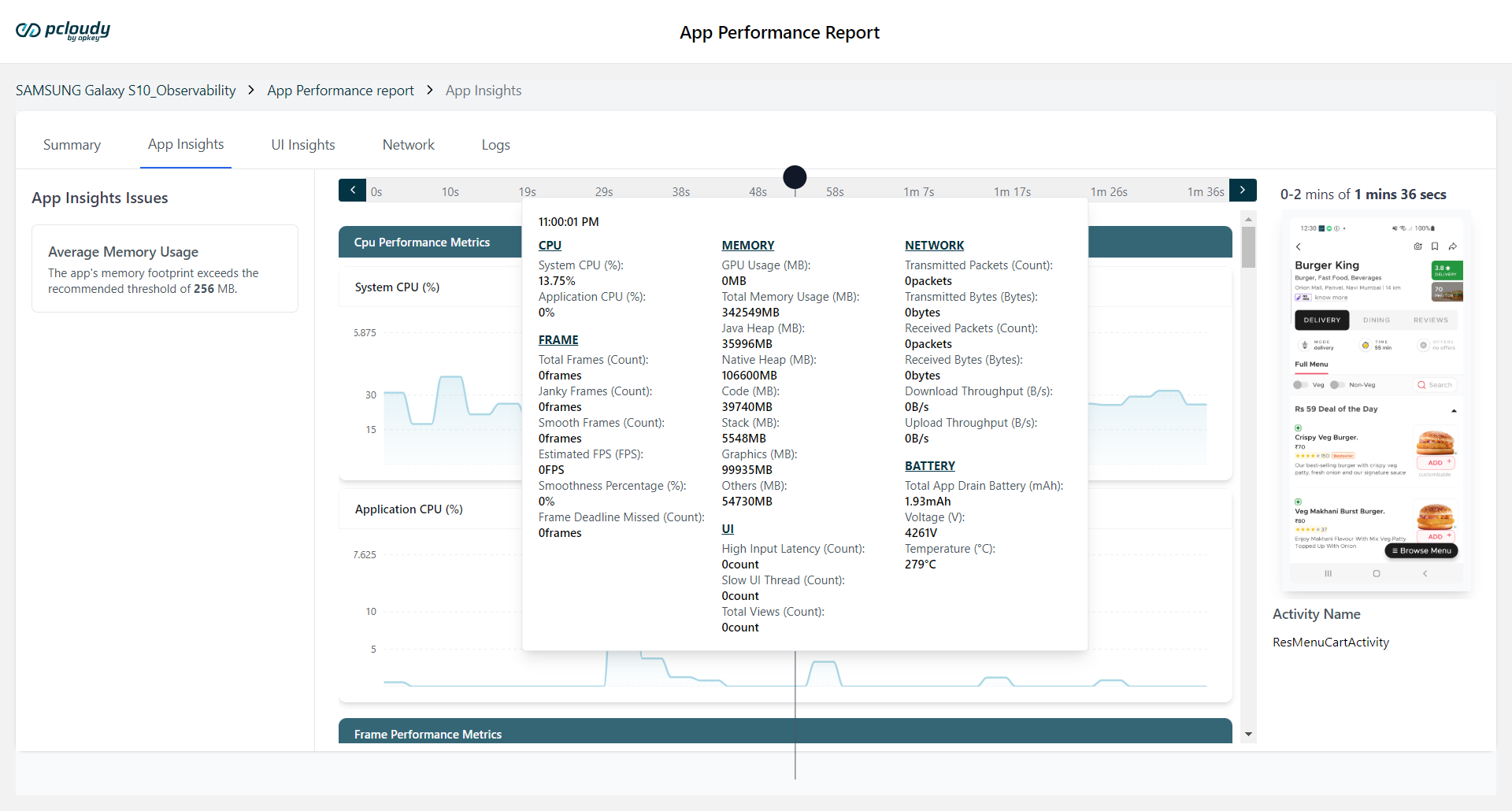 The App Insights section provides a comprehensive performance analysis of an application, offering in-depth visibility into various system metrics that impact its efficiency and user experience. It captures crucial data points related to CPU utilization, memory consumption, network activity, battery usage, and UI responsiveness, helping developers and testers identify potential performance bottlenecks, inefficiencies, or anomalies. By monitoring these metrics, teams can diagnose issues such as excessive resource usage, rendering delays, or network inefficiencies, ultimately improving app stability and optimizing overall performance.