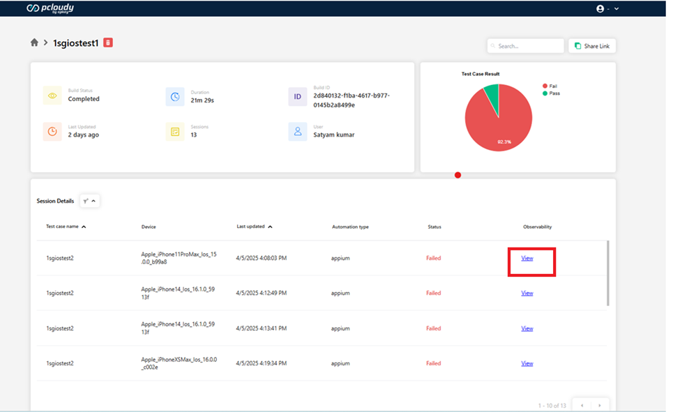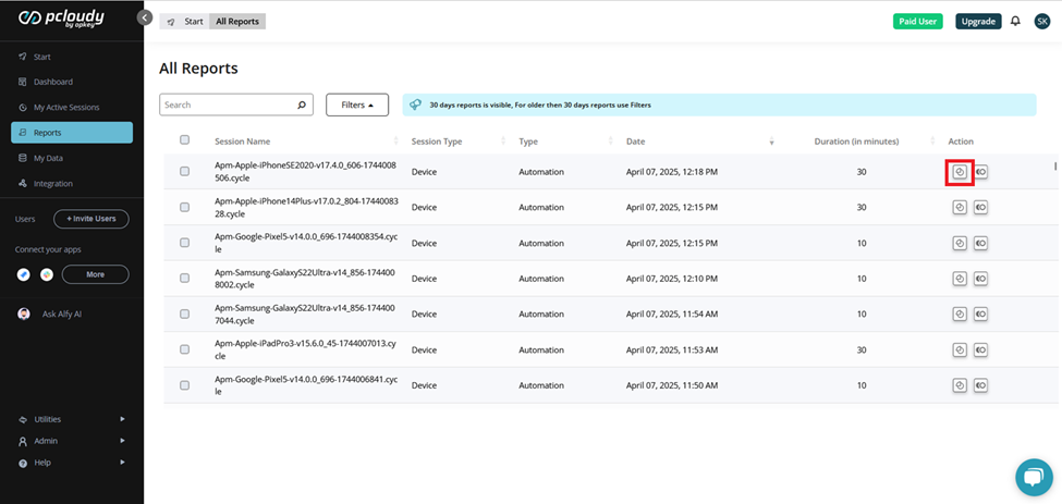 Once the execution stops, you can access the app performance report on the Pcloudy platform by following these steps:
