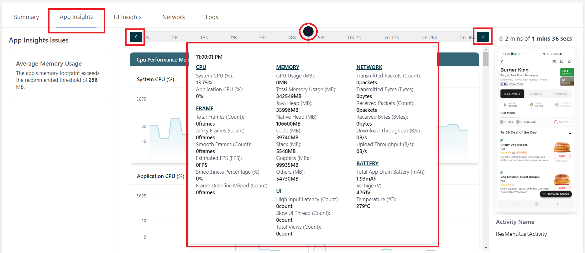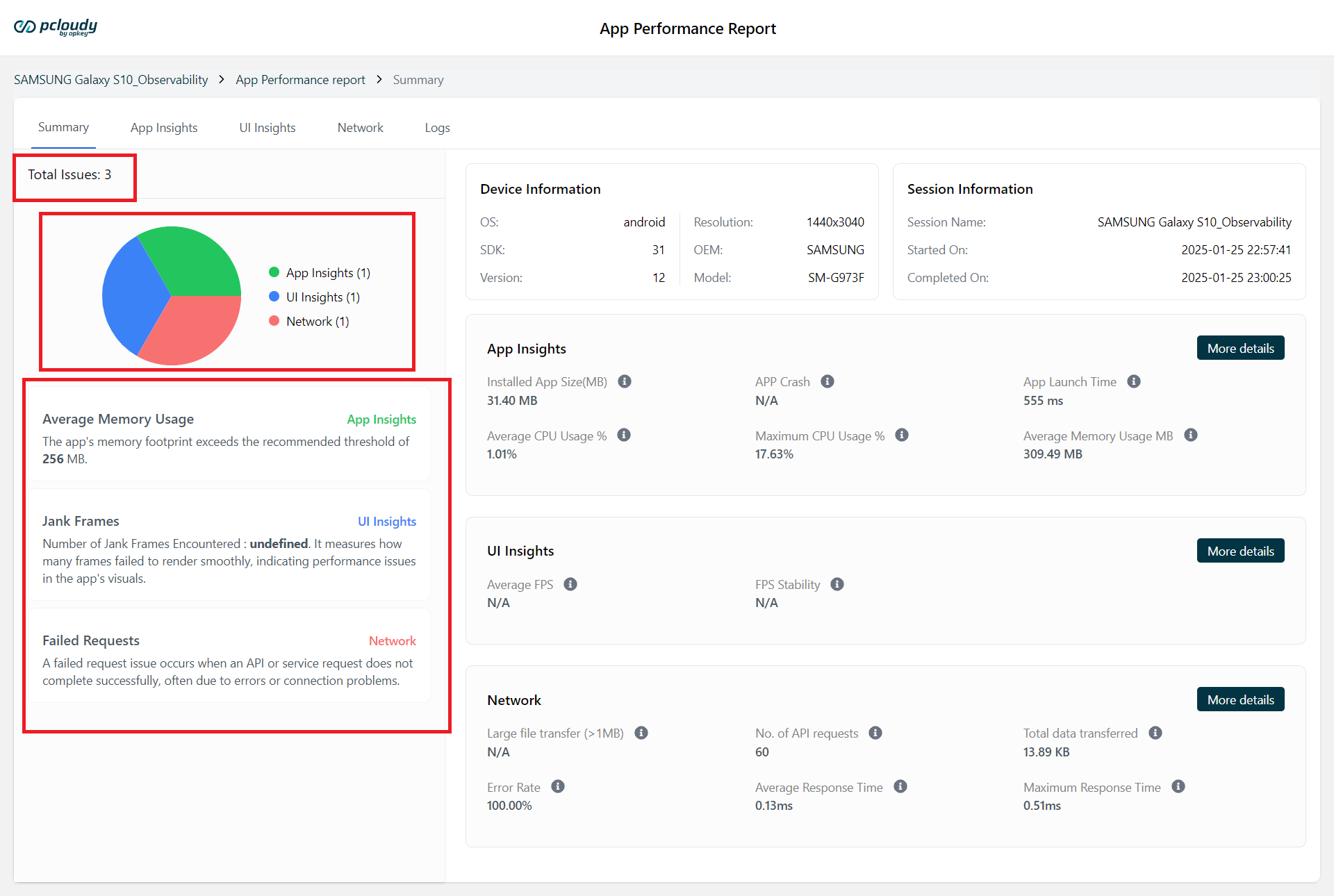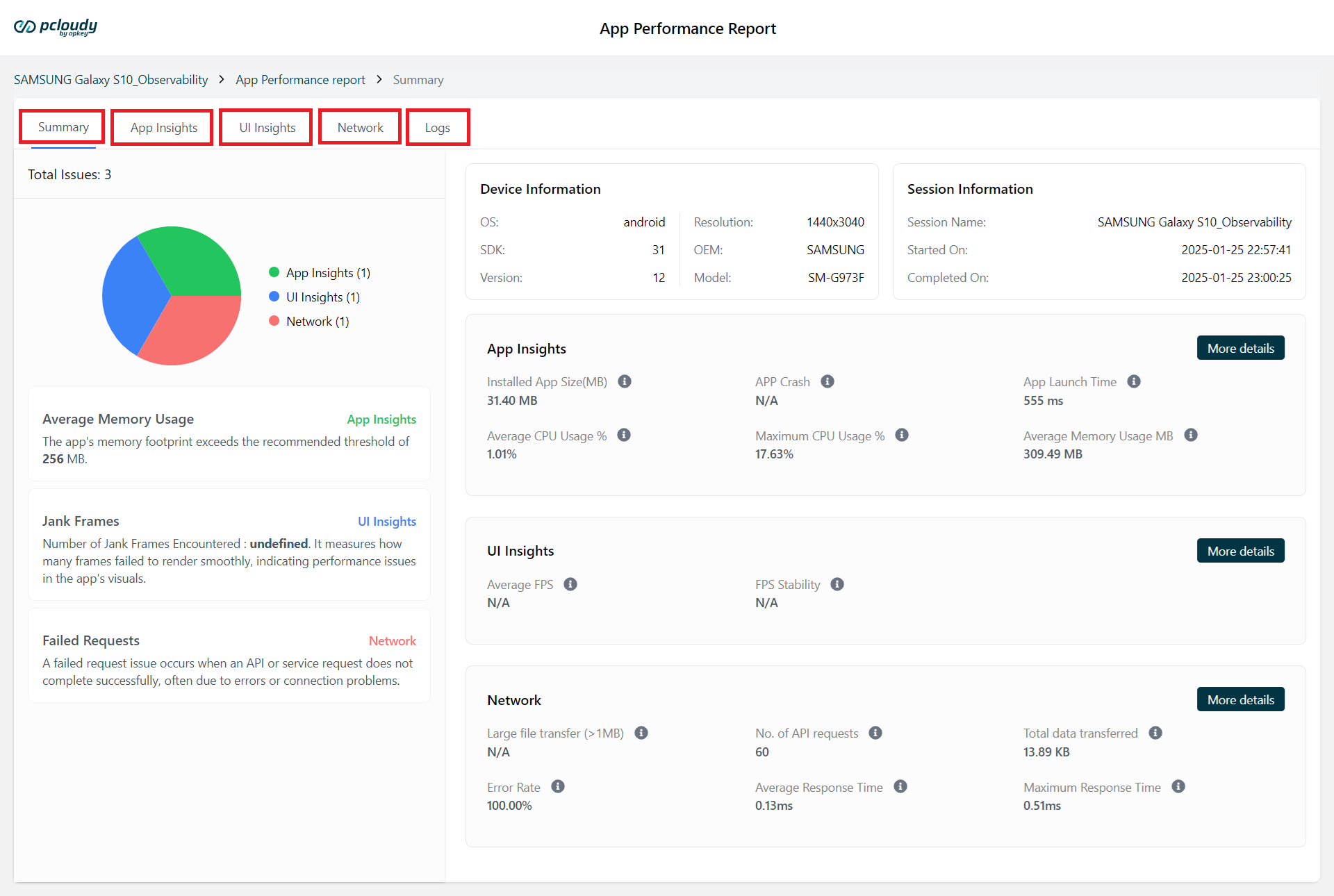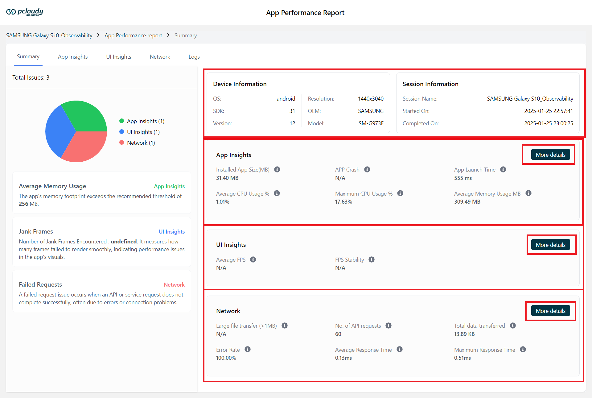 On the Summary page of the App Performance Report, the Right Panel features the test session details and device information on which the app tests were performed. Below the Device and Session Information panel, you can access a quick overview of the App Insights, UI Insights and Network information listed. You can even click on the More details button to access the different sections of the App Performance Report.