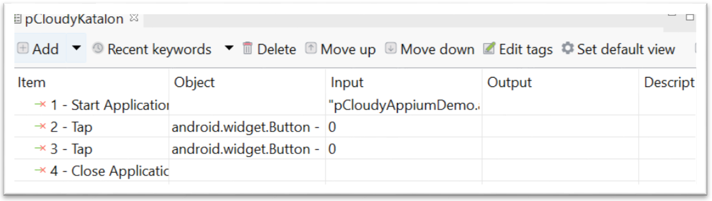 Open an existing project on Katalon which you want to Execute. For Example: Here we are using a sample test case as mentioned below using Mobile keywords, where we Launch an application (Android) and click on two elements and close the application. Note: Provide the application name for the Input of Start Application Keyword.