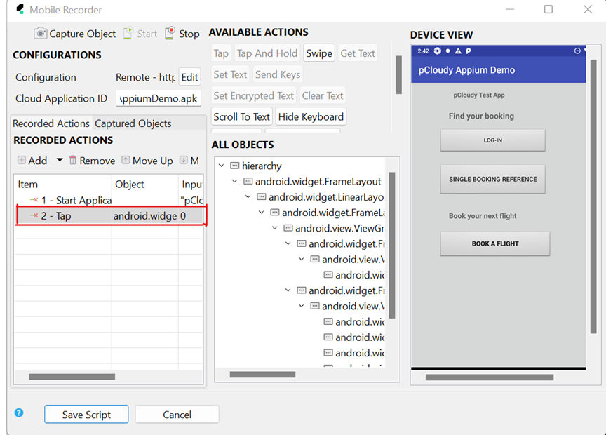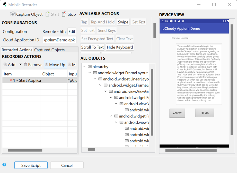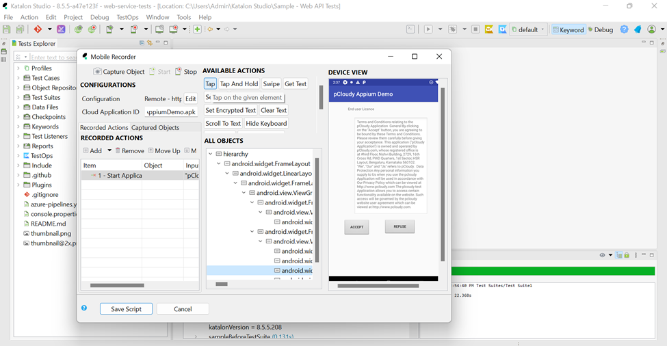 Now you can record the steps on the application via Pcloudy device and create the steps for the test and all the objects will be stored inside Object Repository on Katalon.