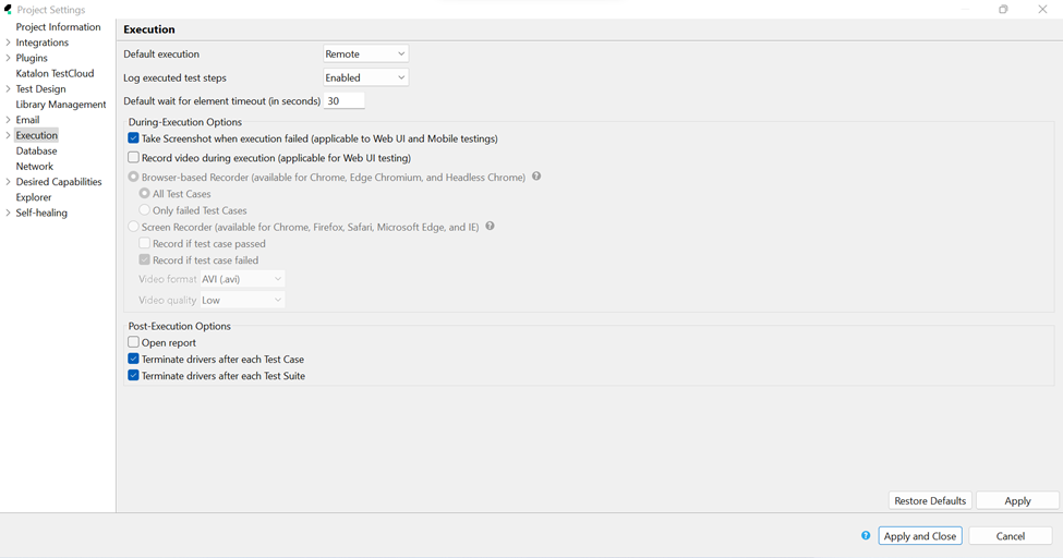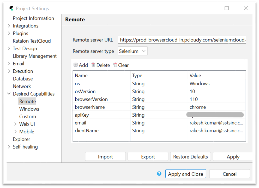 To add the capabilities for Browser Cloud on Katalon remote server, Click on the Project - Settings - Desired Capabilities - Remote
