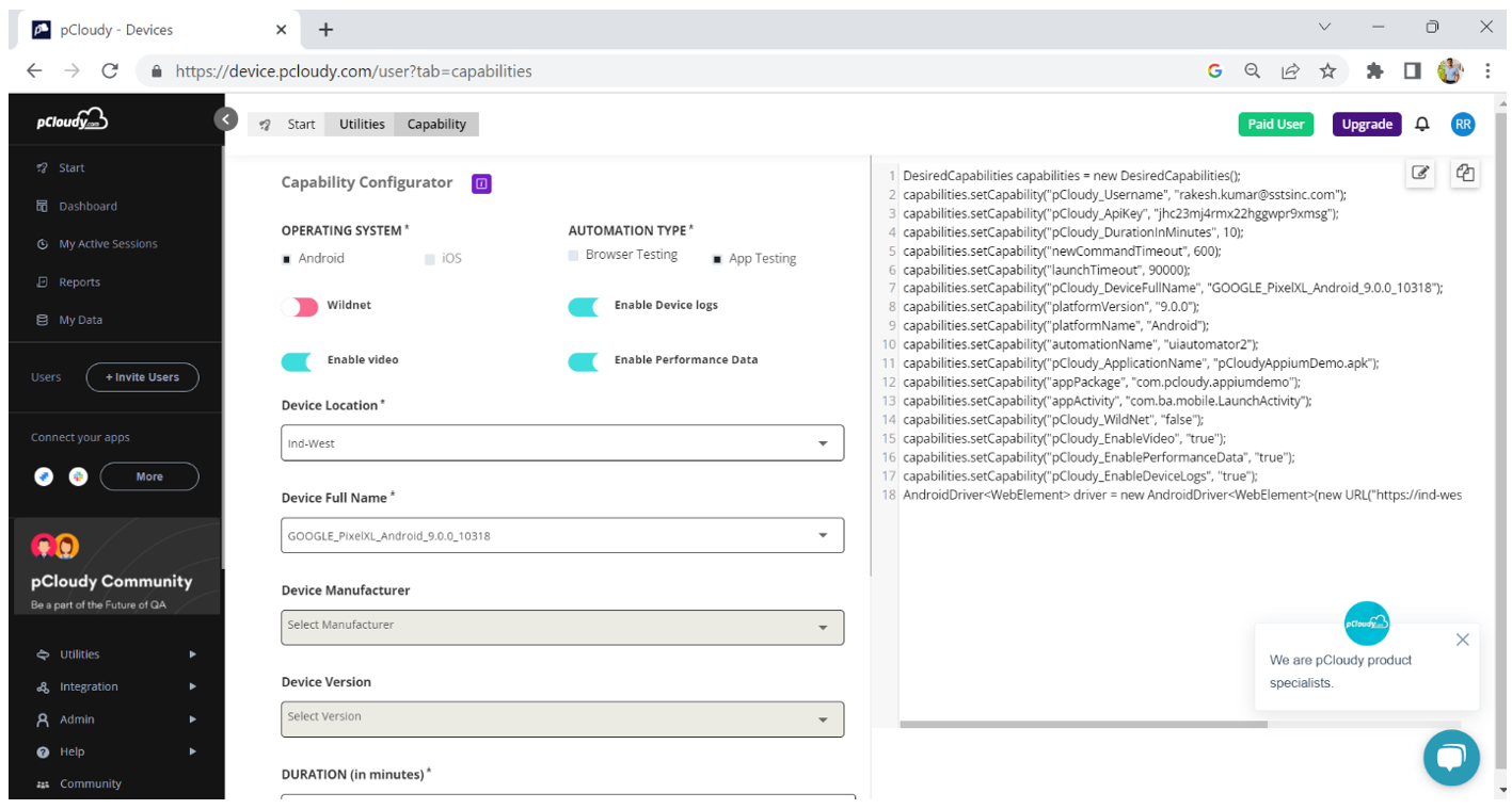 To generate the capabilites , you can use the Capability Configurator from the Pcloudy portal as mentioned below.