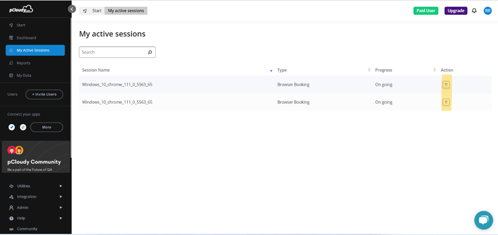 Now the mentioned browser from the capabilities will be acquired on Pcloudy and the scripts will be executed. You will be able to view the live session under My Active Sessions on Pcloudy portal.
