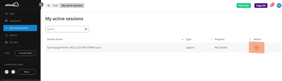 Now the mentioned device from the capabilities will be acquired on Pcloudy and the scripts will be executed. You will be able to view the live session under My Active Sessions on Pcloudy portal.