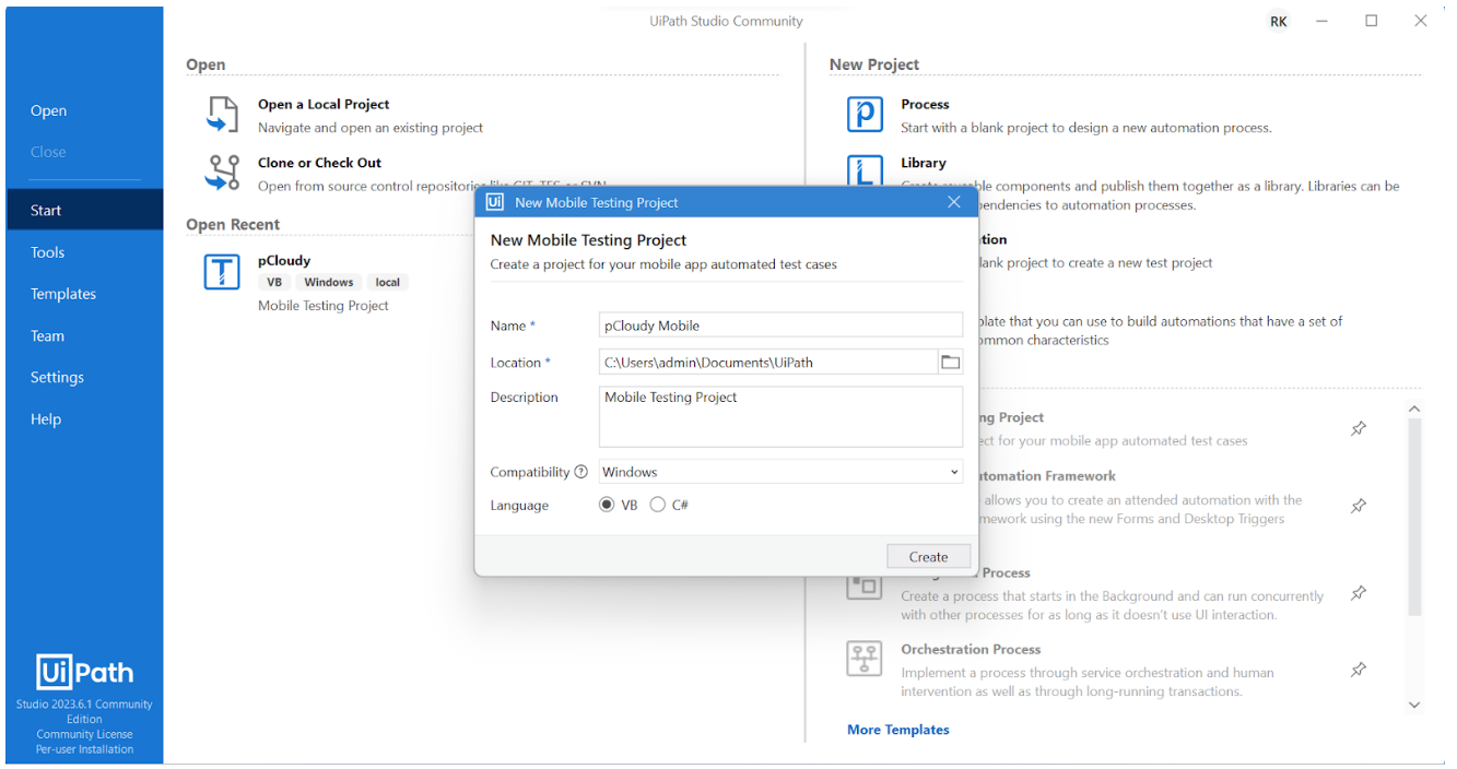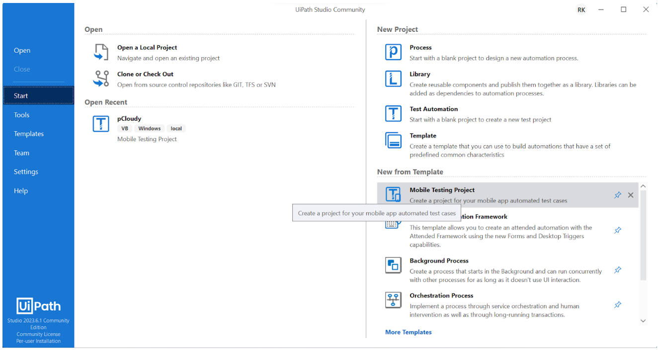 - Launch UiPath Studio and open an existing project or create a new project.