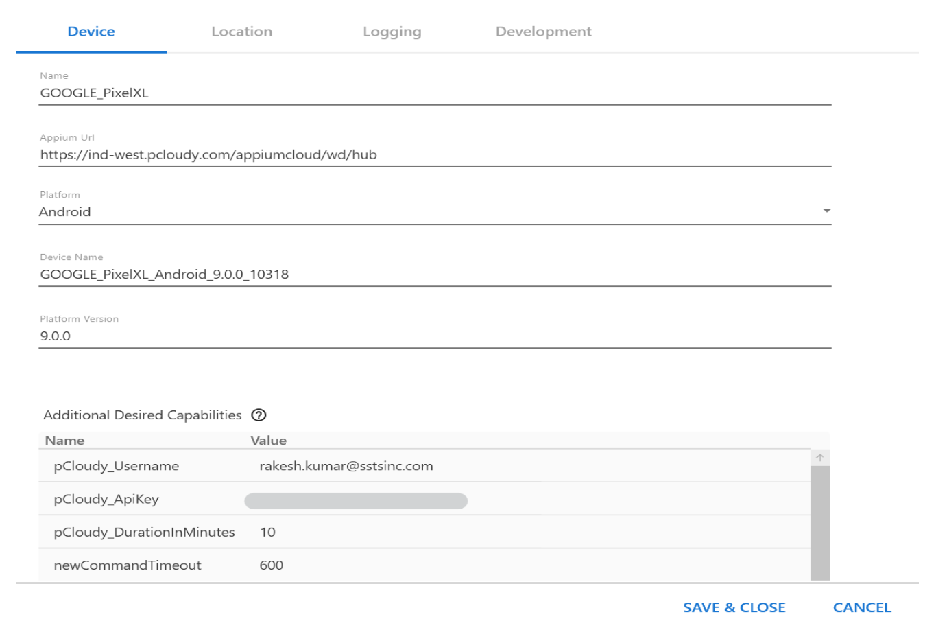 generated from Pcloudy for the desired device as shown below.