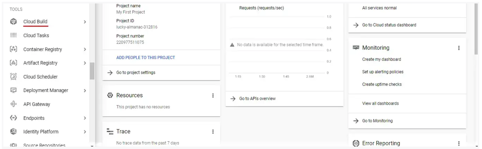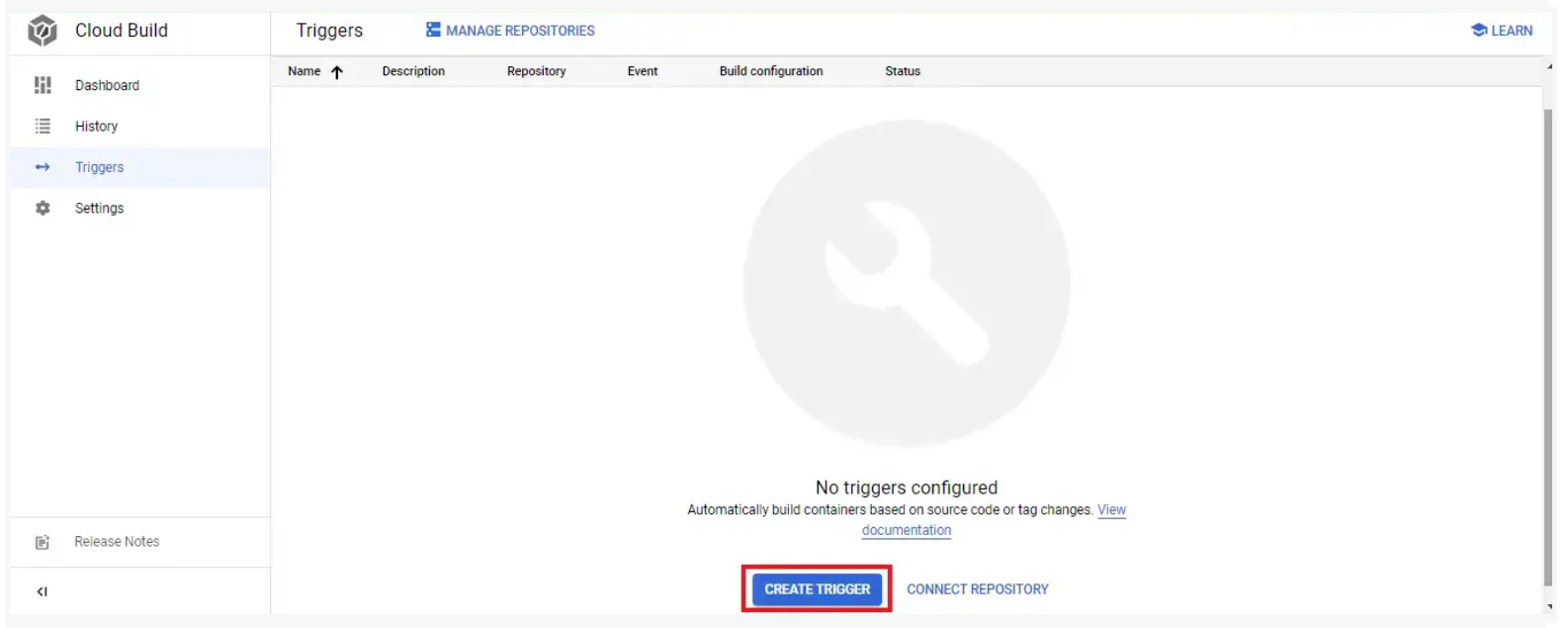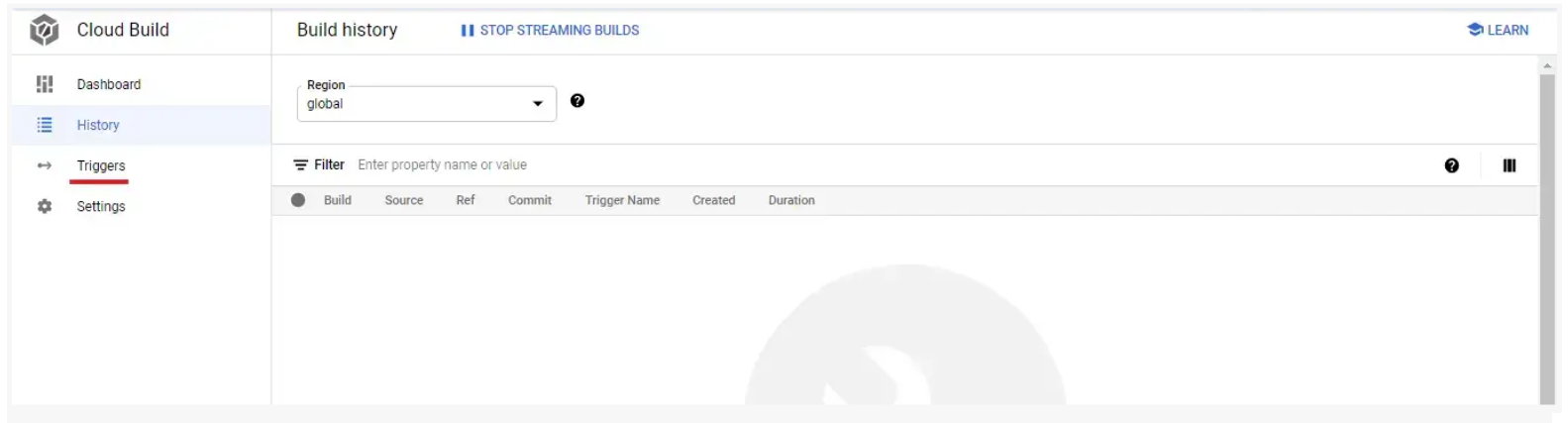 - Go to the Google Cloud CI console and select 'Cloud Build'.