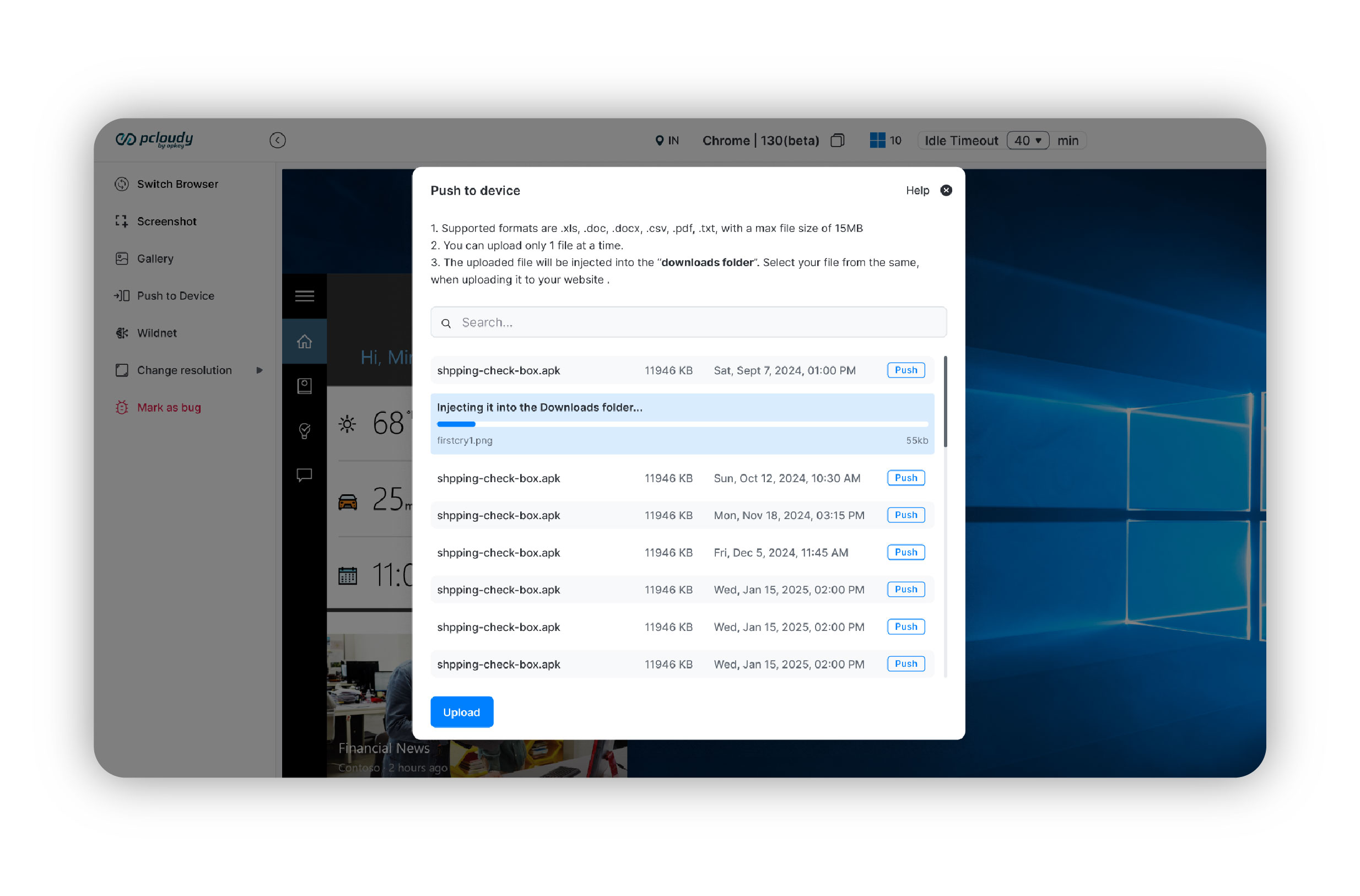 Pcloudy now enables validation of file upload workflows directly within browser sessions using the new Push Files functionality. Users can upload various file types such as media, images, and audio files into real desktop browsers to test upload behavior seamlessly. This removes the need for manual workarounds and ensures teams can validate real-world user interactions more effectively across different browser environments.