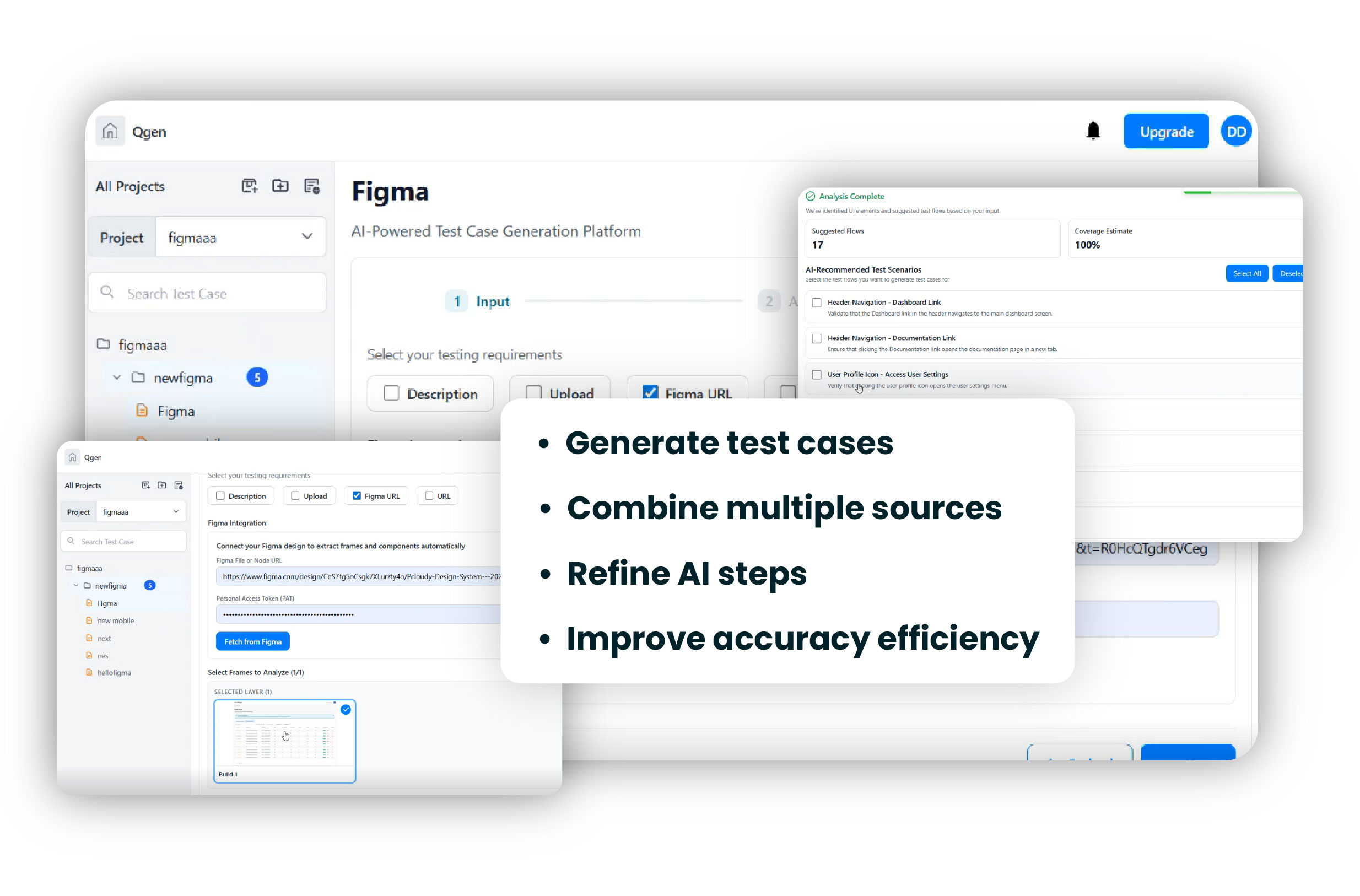 Qgen now supports generating test cases from requirements documents, Figma designs, and multiple input sources combined, enabling teams to create more comprehensive and context-rich test scenarios. This allows users to bring together different artifacts like feature descriptions, screenshots, documents, APIs, and live websites into a single test generation flow.