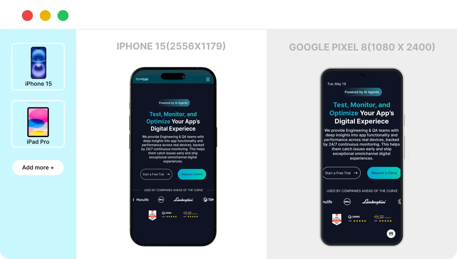 Start testing your apps and websites instantly on real devices. No setup required. Access the world's largest cloud of real Android, iOS devices, and browsers for comprehensive live testing.